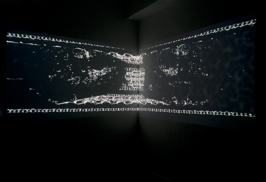 By projecting on two walls meeting in a corner, the images influence each other, they colour each other, sometimes almost extinguish each other.